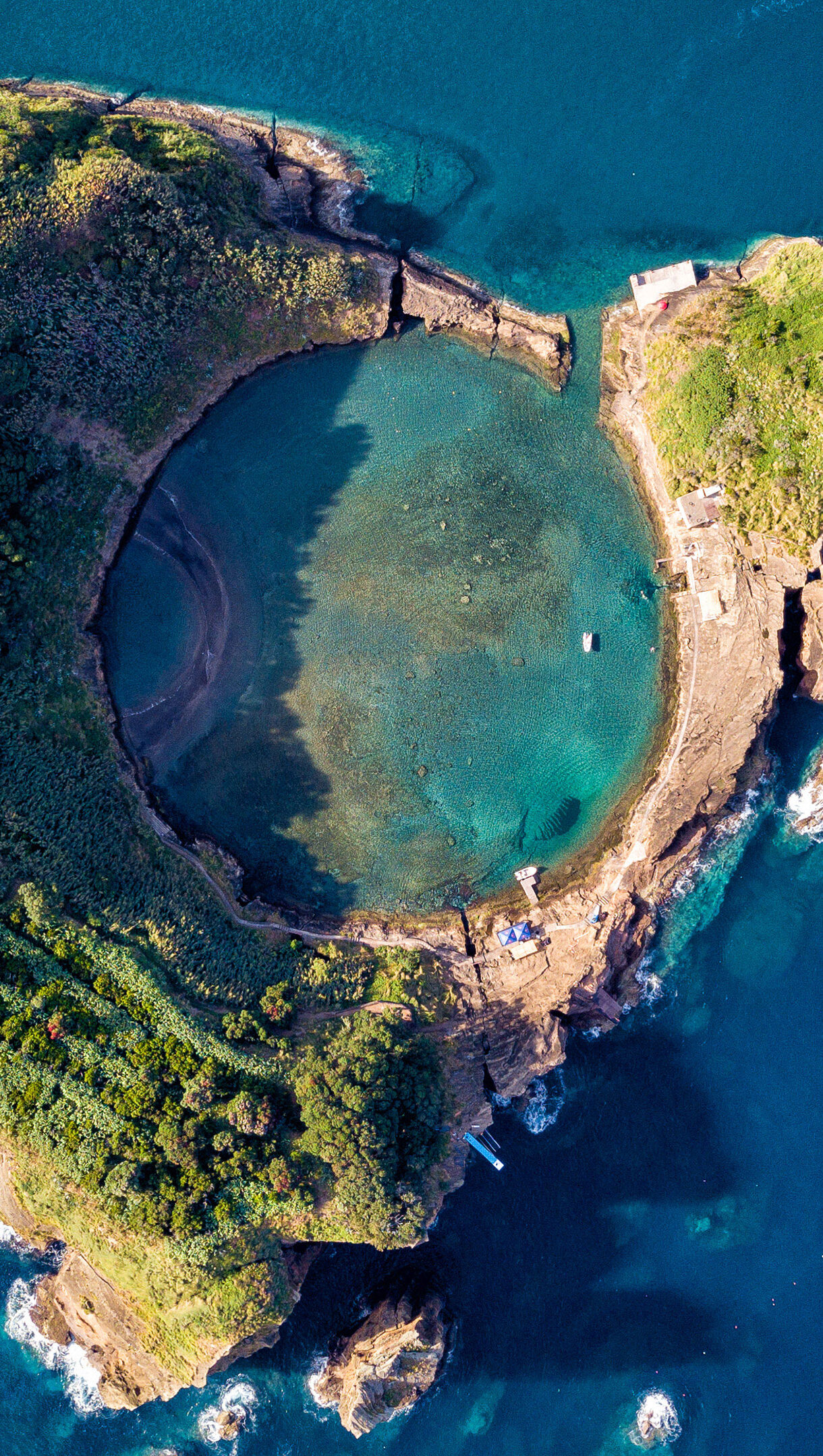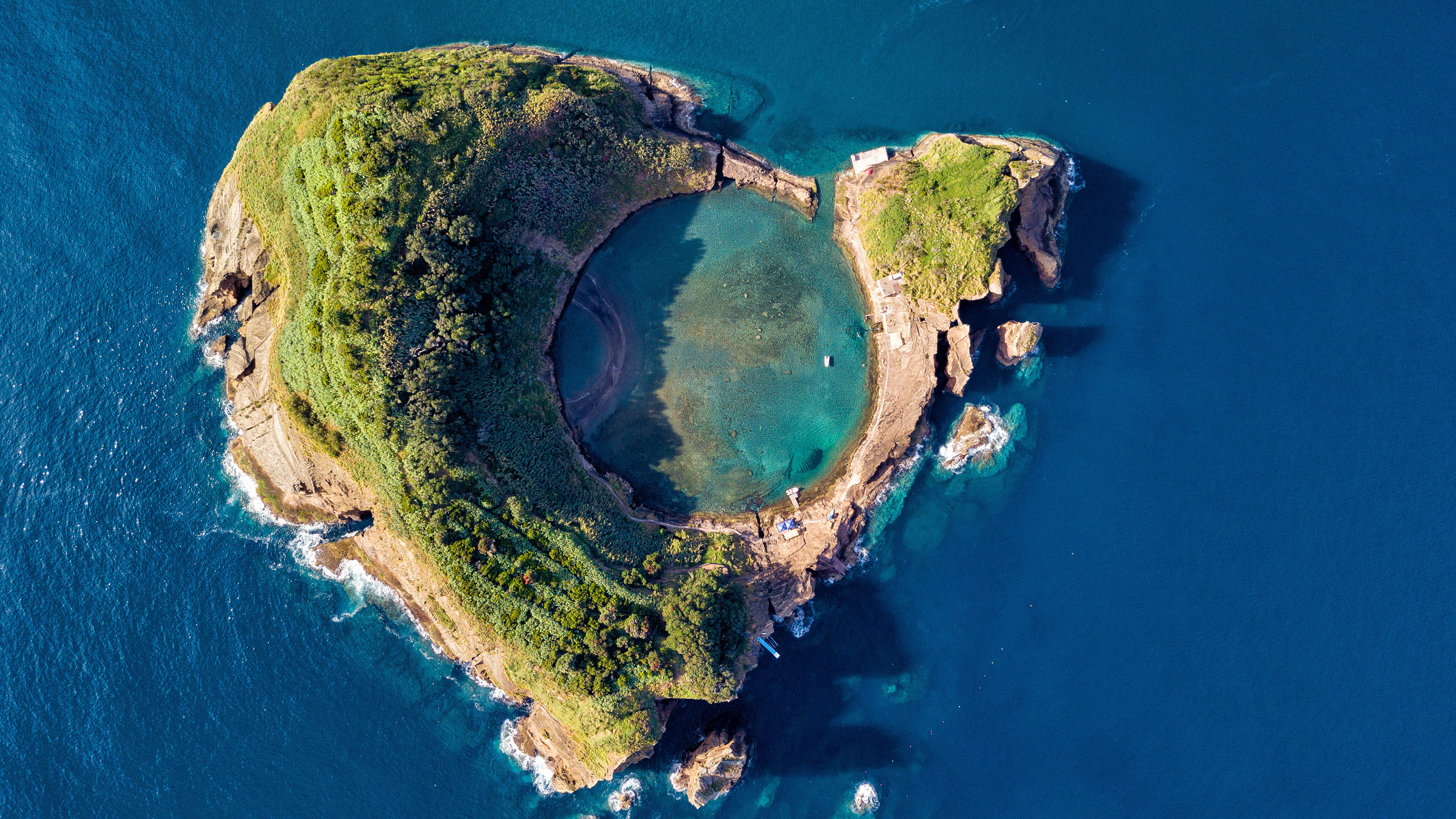A breathtaking 4K wallpaper showcases an aerial view of the crescent-shaped Vila Franca Islet off São Miguel Island. Its vibrant natural pool, enclosed by the green-covered volcanic rock, glows with turquoise waters that contrast sharply with the surrounding deep blue Atlantic Ocean.