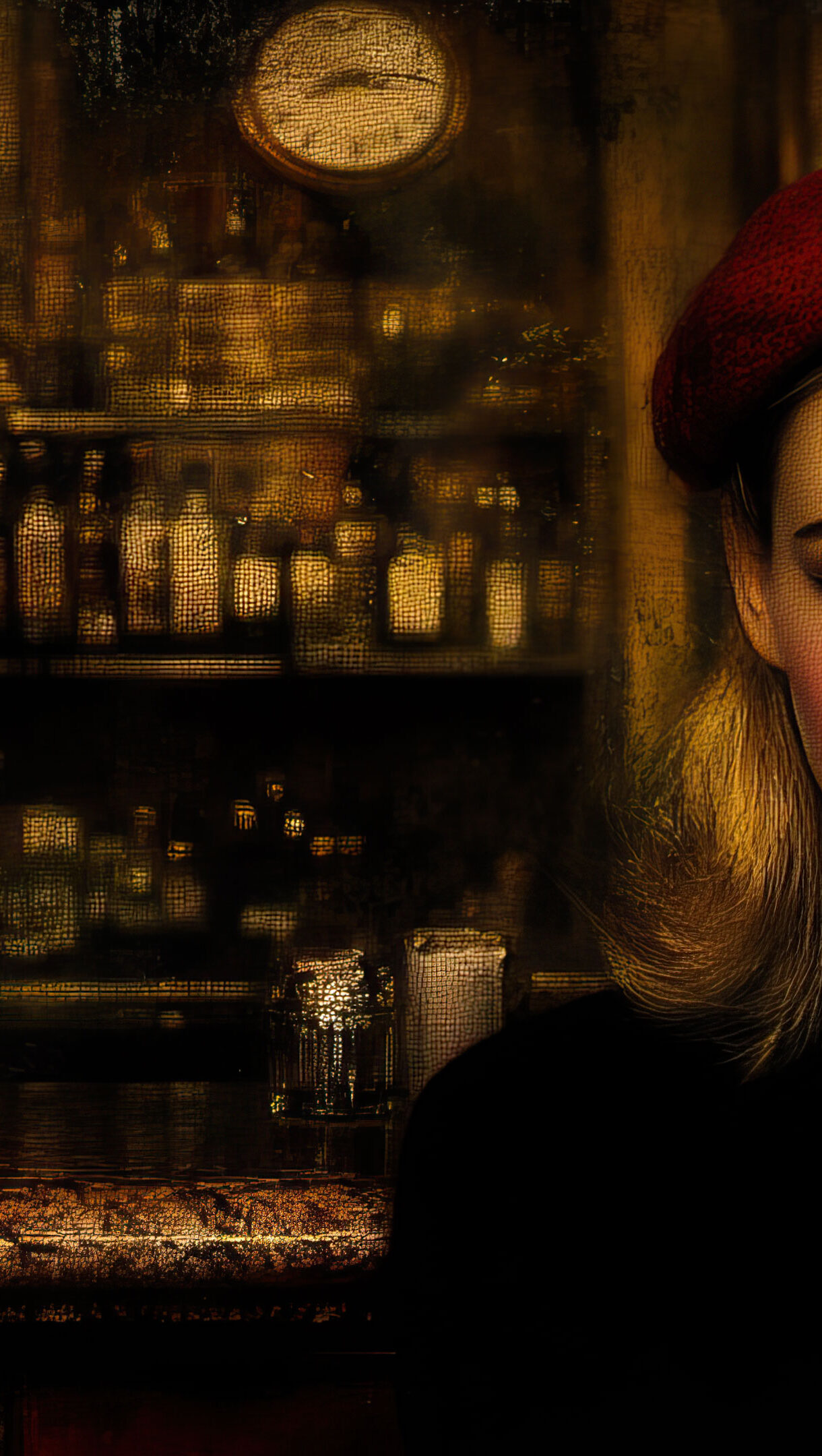 A stunning 4K wallpaper featuring a vintage femme fatale seated in a dimly lit bar. The classic noir aesthetic, combined with the mysterious allure of the femme fatale, evokes the glamour and intrigue of old Hollywood, making it an ideal choice for your desktop or mobile background.