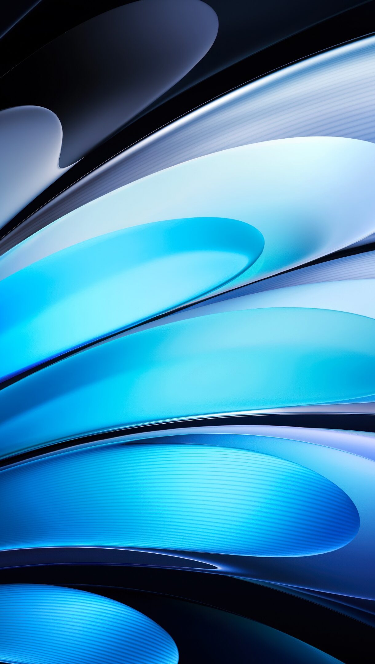 Abstract blue and white shapes curve and fan across a dark background, glowing with gradients from deep navy to vibrant turquoise, some featuring subtle horizontal textures.