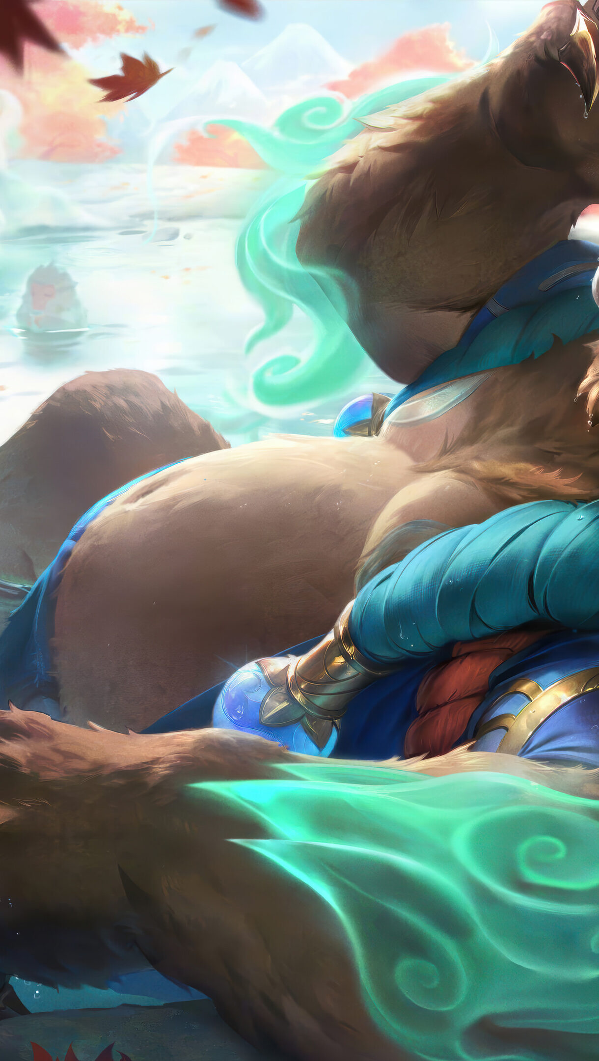 A tranquil 4K wallpaper featuring Volibear, a majestic bear-spirit adorned with azure and gold, comfortably immersed in a misty, autumn hot spring. His glowing cerulean eyes and swirling ethereal teal energy strikingly contrast with the warm, hazy steam and floating crimson maple leaves, evoking a deep sense of peace and mystic calm.