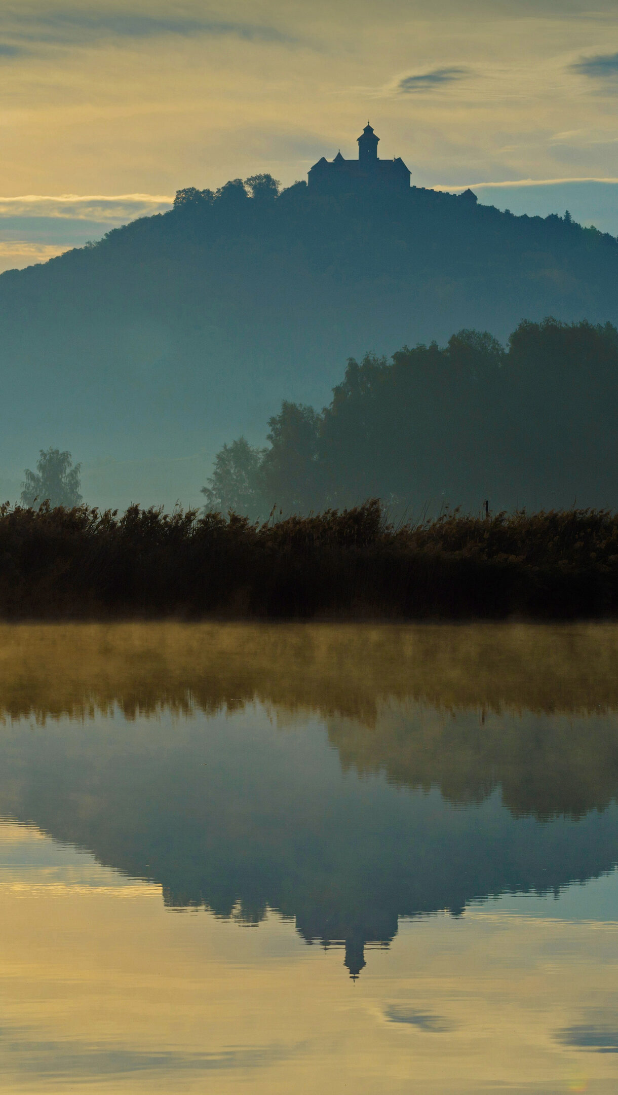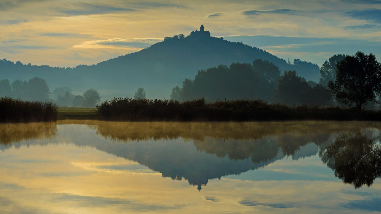 A serene 4K wallpaper captures Wachsenburg Castle in Erfurt, Germany, silhouetted atop a misty hill during a foggy morning, overlooking a calm lake. The castle's outline and the golden hues of the dawn sky are perfectly mirrored on the still lake, creating a tranquil and dreamlike atmosphere.