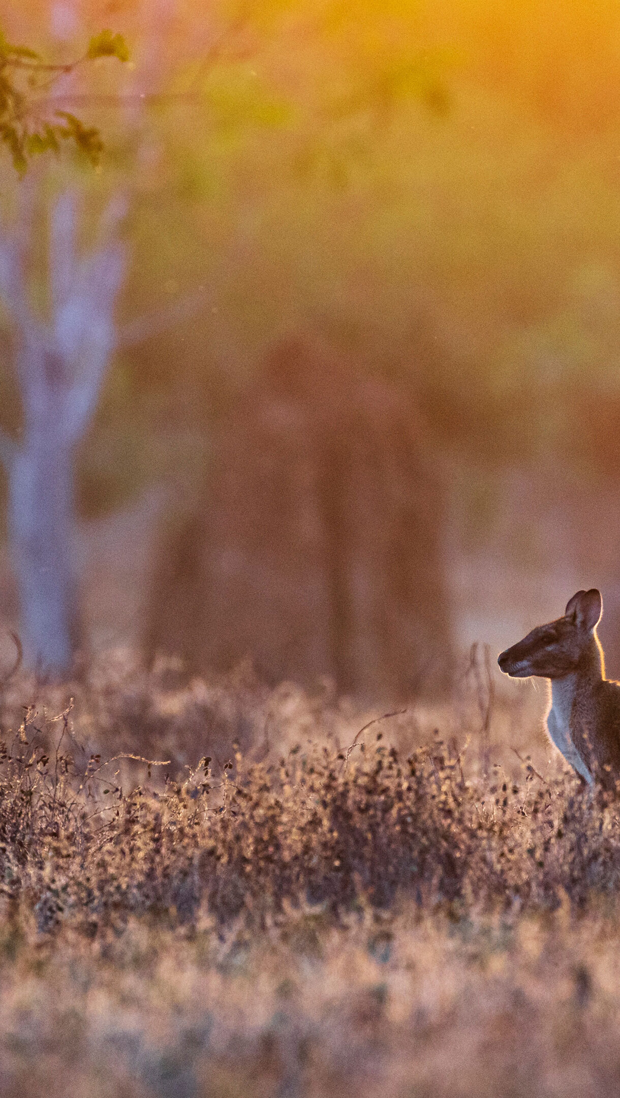 A stunning 4K wallpaper features two wallabies standing alert in a sun-drenched grassy field at sunrise along the Adelaide River in the Northern Territory. Golden morning light bathes the scene, creating a soft, ethereal glow around the wallabies and illuminating the dry, textured grasses with warm, inviting hues.