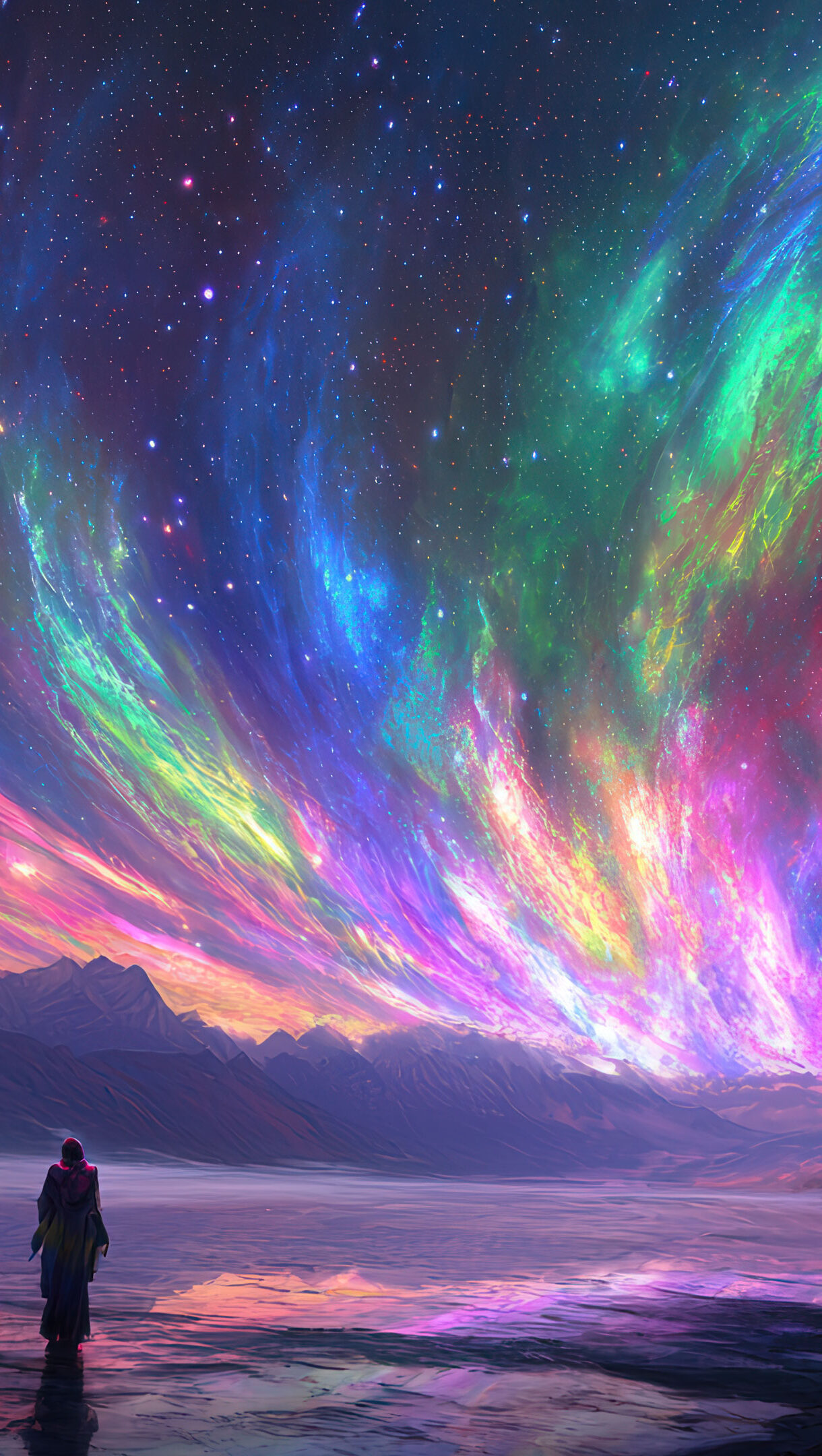 A stunning 4K wallpaper featuring two lone wanderers standing beneath a vast galactic sky, illuminated by the glow of the Milky Way. Towering silhouettes of mountains frame the scene as countless stars stretch across the heavens, evoking a sense of wonder, solitude, and cosmic exploration.