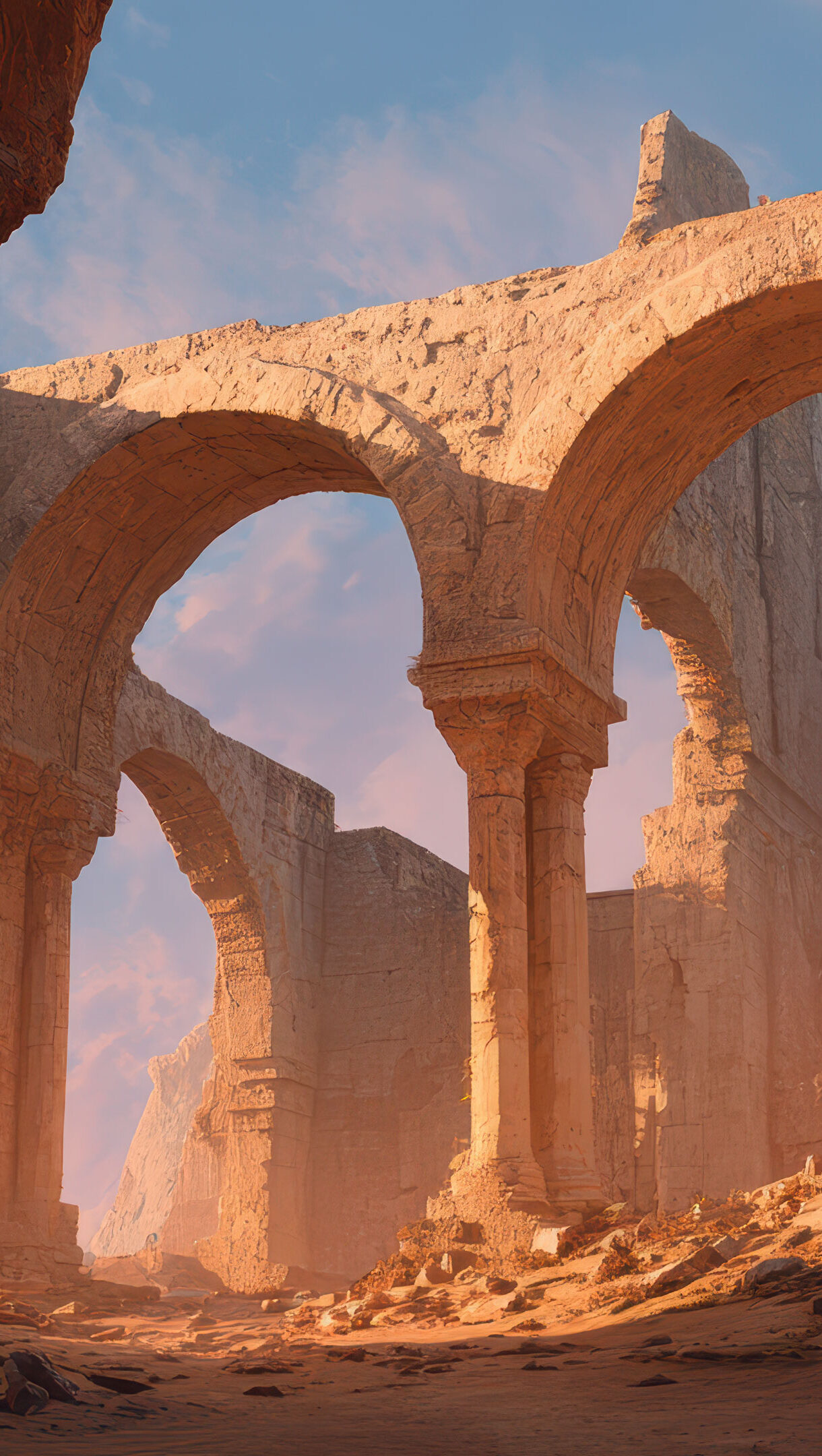 An evocative 4K wallpaper presents a grand digital art landscape of ancient desert ruins. Golden light bathes the towering, crumbling arches and rugged rock formations, creating a breathtaking sense of timeless solitude and warmth.