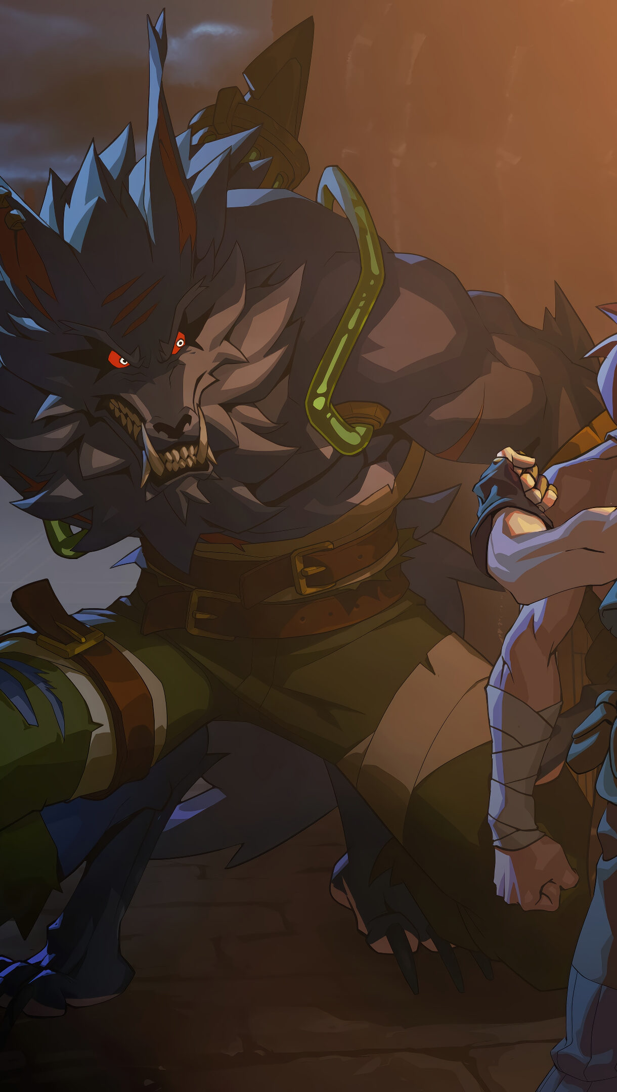 A fierce 4K wallpaper presents Warwick, the monstrous augmented wolf from 2XKO, clashing with opponents on a shadowy street at night. The scene is powerfully illuminated by a bright full moon on the left and a warm, glowing structure on the right, emphasizing Warwick's snarling ferocity and the chaotic struggle.