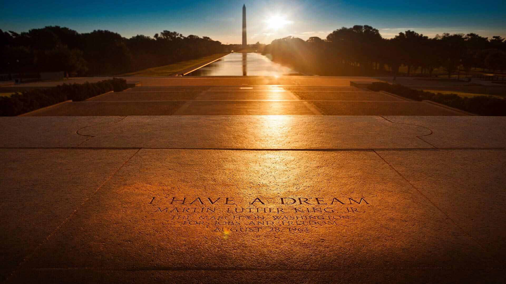 A powerful 4K wallpaper highlights the Washington DC Lincoln Memorial Steps, distinctly marked with the I Have a Dream inscription from Martin Luther King Jr.'s historic speech. The setting sun bathes the textured stone in a golden glow, beautifully illuminating the words and leading the eye towards the Reflecting Pool and the distant Washington Monument.