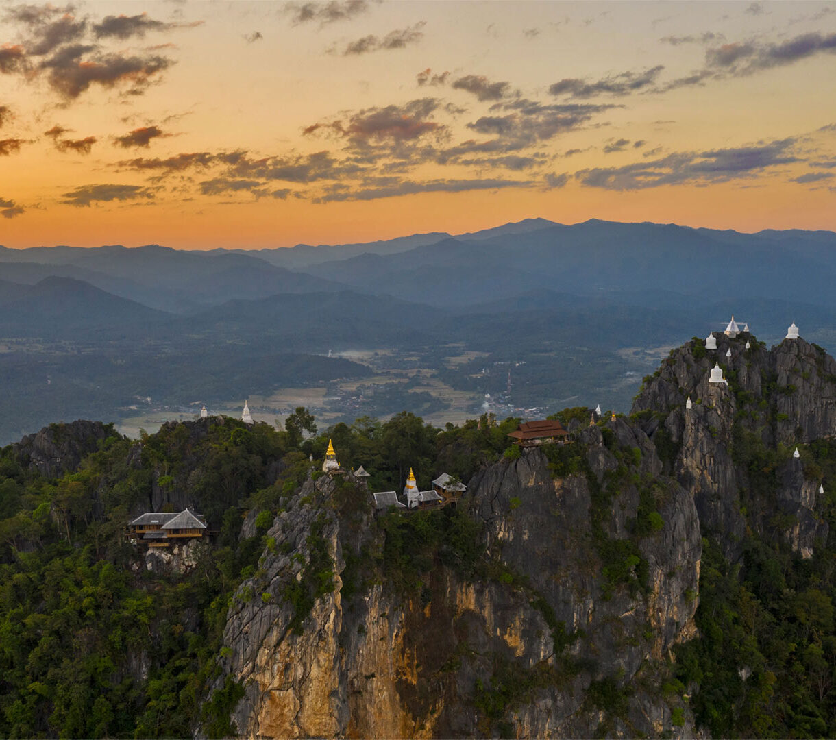 A majestic 4K wallpaper showcasing the Wat Chaloem Phra Kiat Phrachomklao Rachanusorn Temples perched dramatically on rugged mountain peaks. The scene is bathed in the warm, golden light of sunset, casting a serene glow over the distant mountains and highlighting the pristine white chedis against the fading sky.