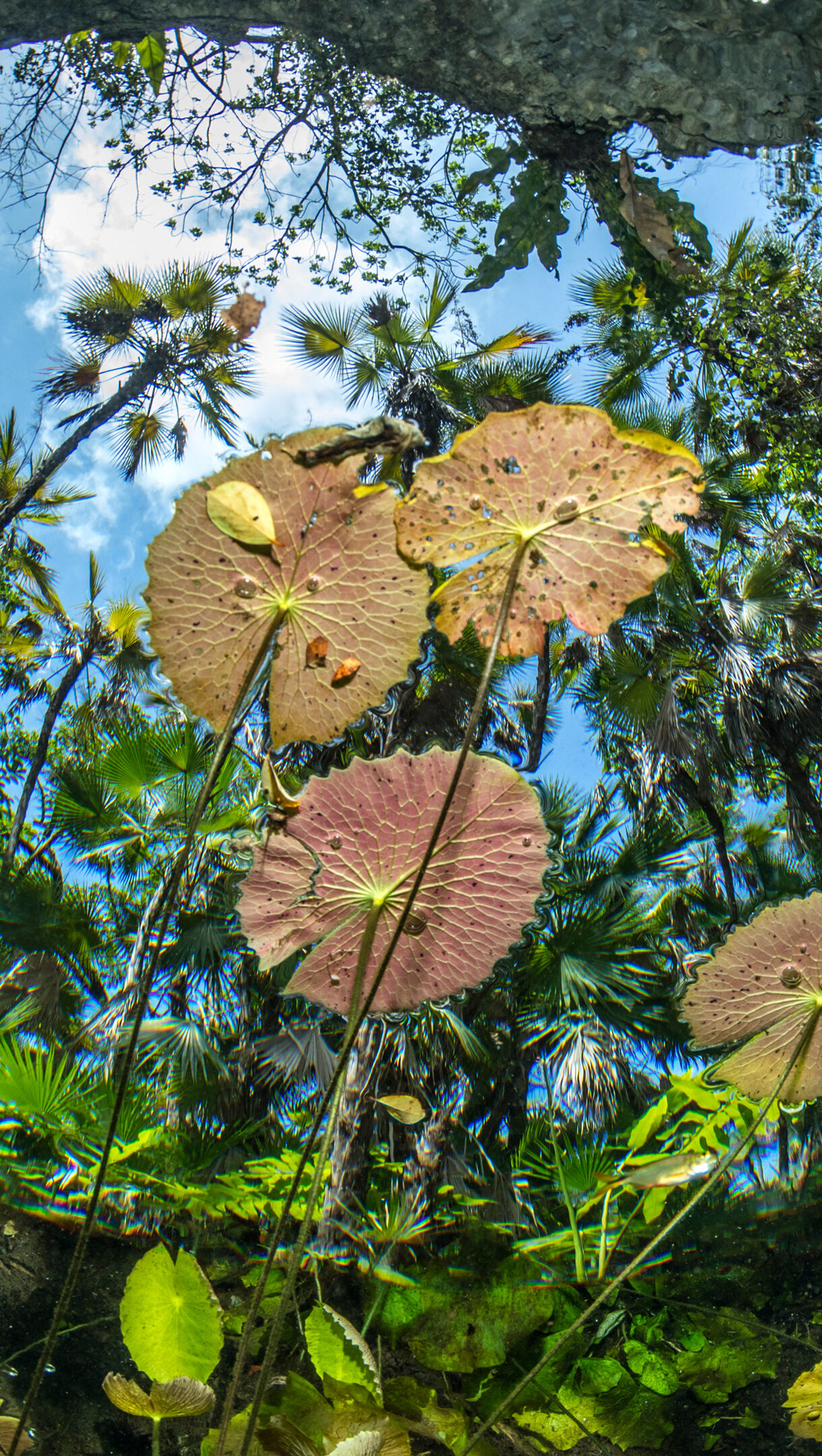A mesmerizing 4K wallpaper presents an immersive underwater view of water lilies floating in Cenote Nicte-ha, Tulum. The clear water reveals the intricate undersides of the lily pads alongside the vibrant jungle canopy and bright blue sky above, all beautifully distorted by surface reflections.
