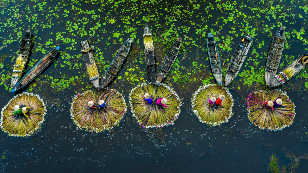 An exquisite 4K wallpaper showcases the traditional Water Lily Harvest in the Mekong River Delta, Long An, Vietnam, where groups of harvesters work among floating lily pads. The scene is defined by vibrant circular bundles of water lily stems and delicate white and purple flowers, creating a visually rich pattern against the dark water.