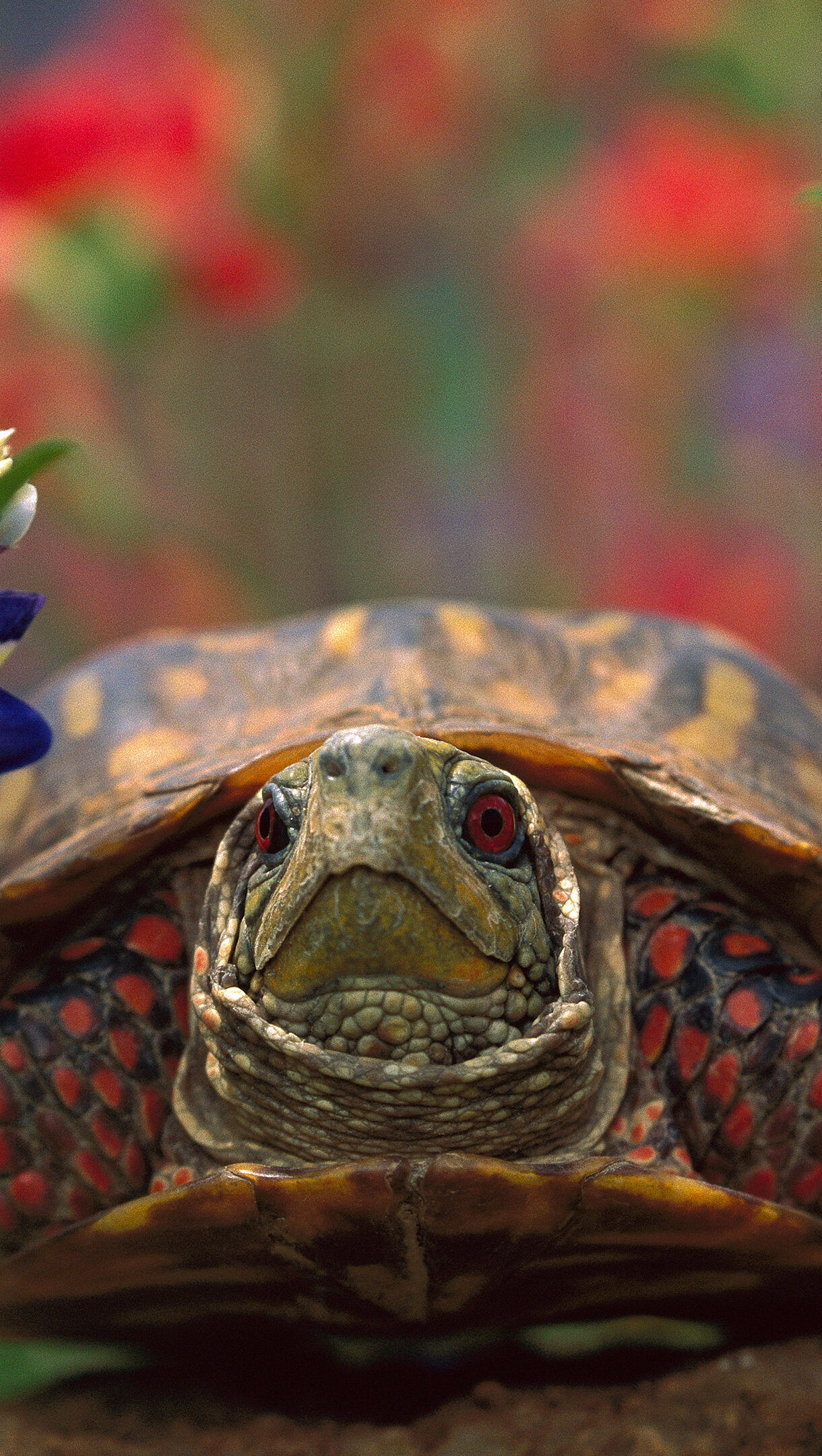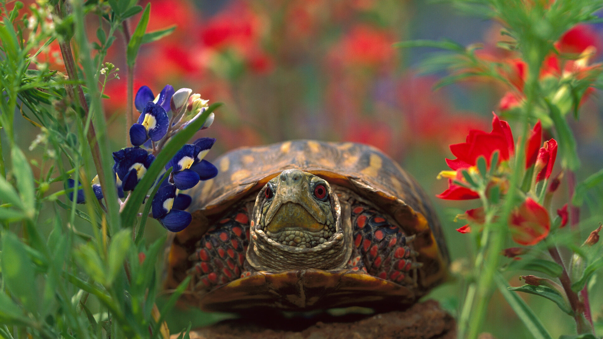 A picturesque 4K wallpaper presents a Western Box Turtle nestled low among a vibrant field of wildflowers. Its attentive red eyes and patterned shell are framed by vivid bluebonnets and scarlet Indian Paintbrush, creating a vibrant, serene natural portrait.