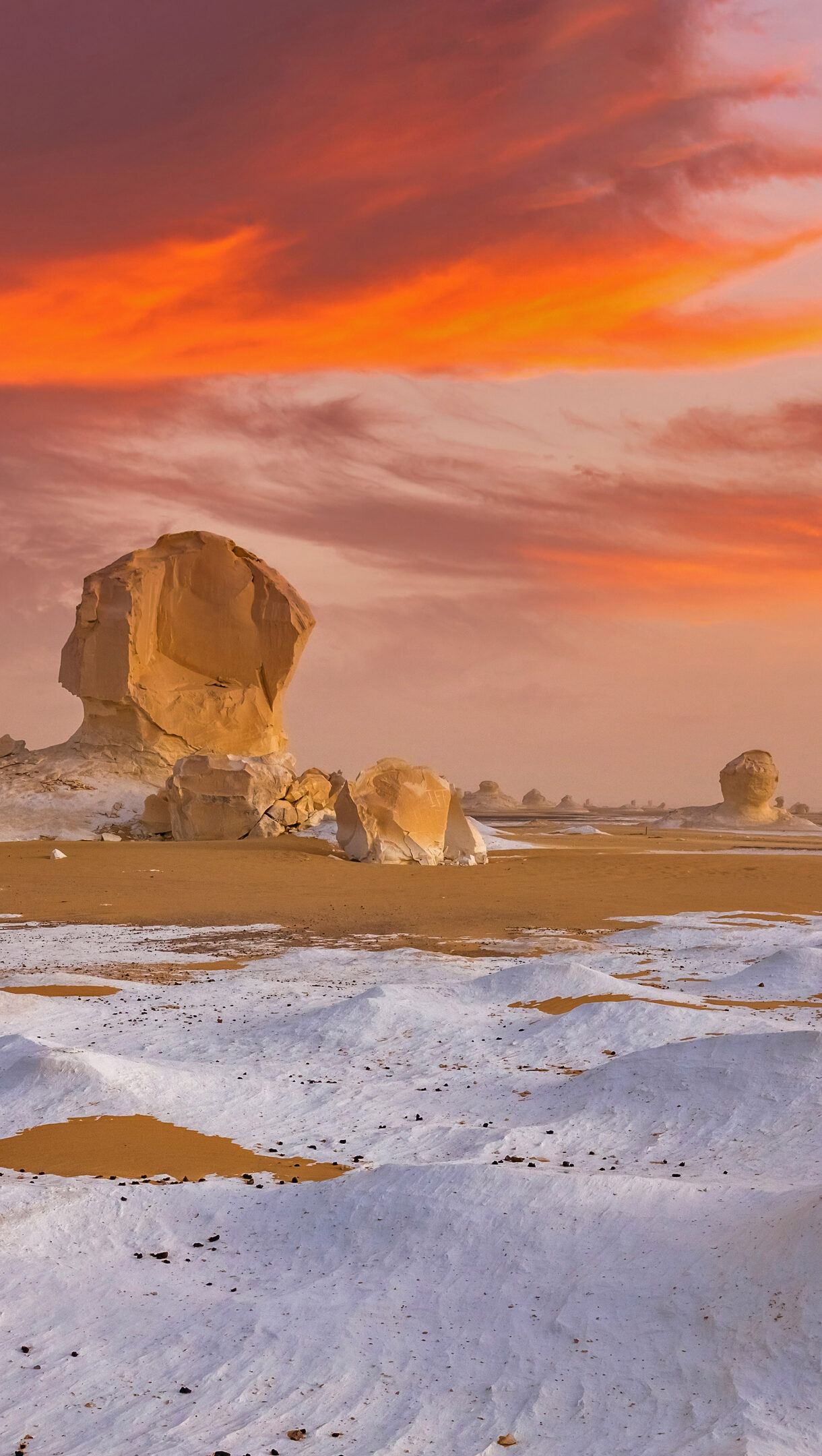 An evocative 4K wallpaper depicting surreal white rock formations scattered across the vast White Desert of Egypt. The dramatic orange and red hues of the sunset sky cast a warm glow, contrasting with the stark white chalk formations and golden sands.