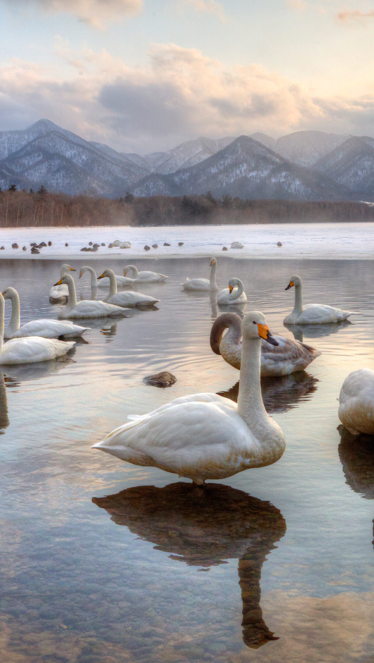 A captivating 4K wallpaper depicts numerous Whooper Swans gathered in the clear, shallow waters of Japan's Lake Kussharo during winter. The scene is bathed in a warm, ethereal golden light from the low sun, creating stunning reflections on the water that beautifully contrast with the snow-dusted mountains and bare winter trees.