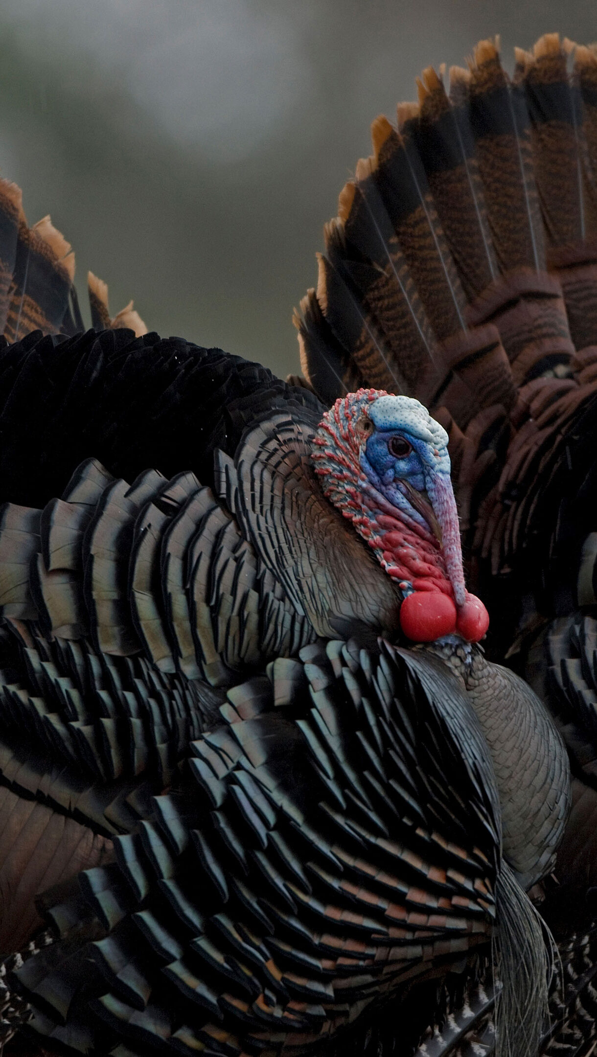A majestic 4K wallpaper featuring two wild turkeys, prominently displaying their fanned tails in a soft natural setting. The intricate, iridescent patterns of their widespread tail feathers, along with the vibrant blue and red coloration on their heads, are beautifully highlighted by the diffused light.