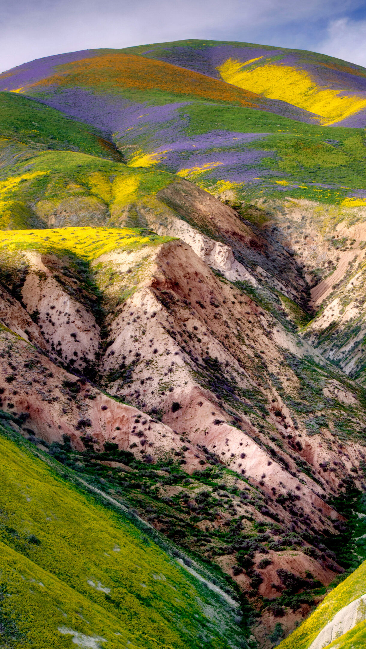 A breathtaking 4K wallpaper showcases the vibrant wildflowers blanketing the undulating hills of Carrizo Plain National Monument, California. Brilliant swathes of yellow and purple blooms create a stunning tapestry across the rugged landscape, emphasizing the dramatic contours and sun-drenched valleys.