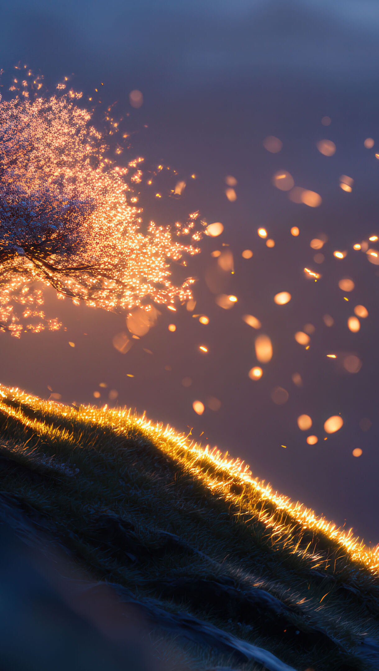 A stunning wallpaper where a lone blossom tree stands on a steep hillside at sunset. A strong breeze creates a flurry of windblown petals that dance and sparkle in the warm, golden light of the setting sun.