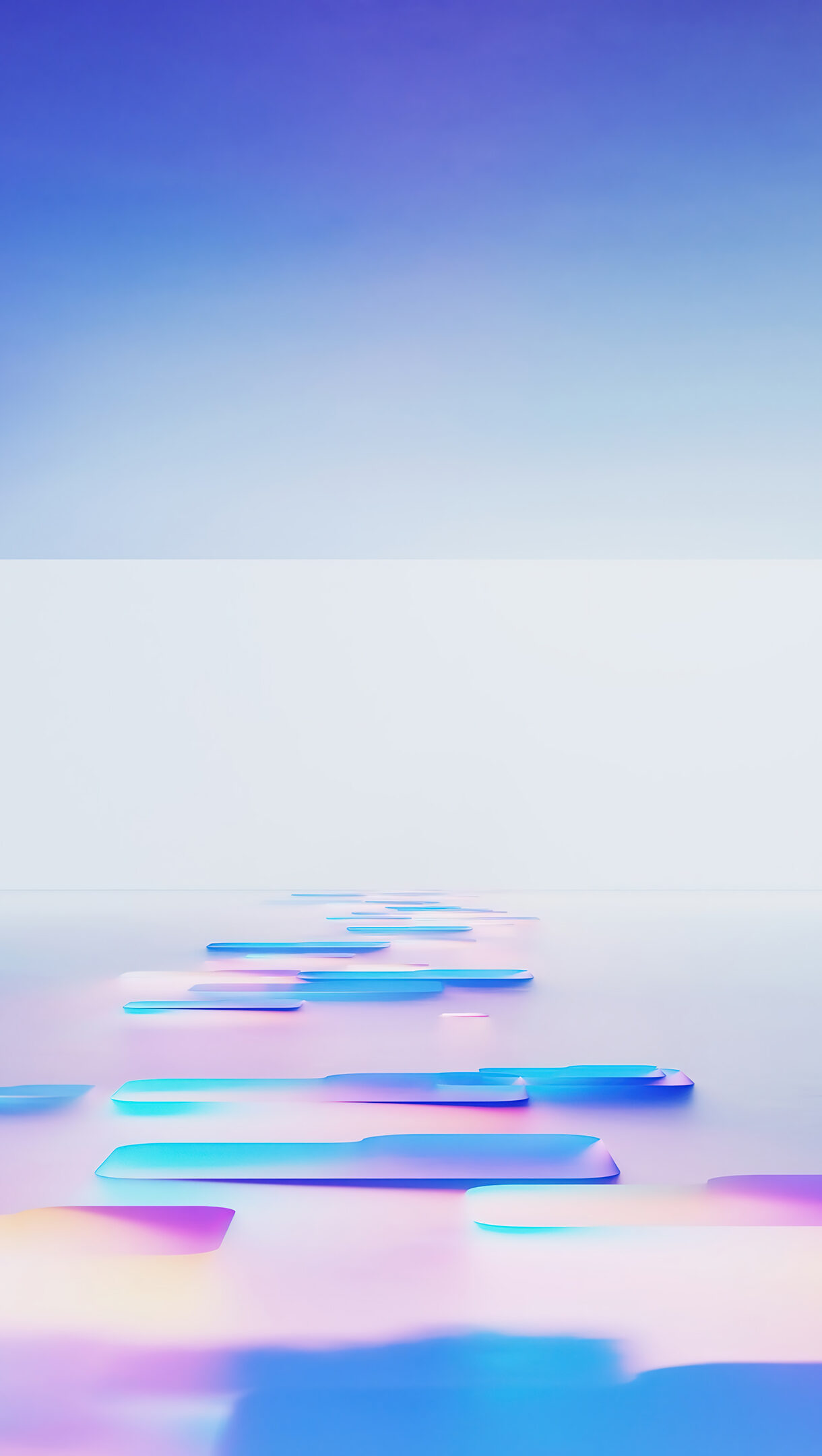 A futuristic 4K wallpaper featuring an abstract pathway of glowing, rounded shapes leading through a minimalist corridor bathed in blue and purple light. The vibrant, translucent quality of the floating elements casts a soft, illuminating glow on the reflective floor, creating a serene and ethereal digital environment.