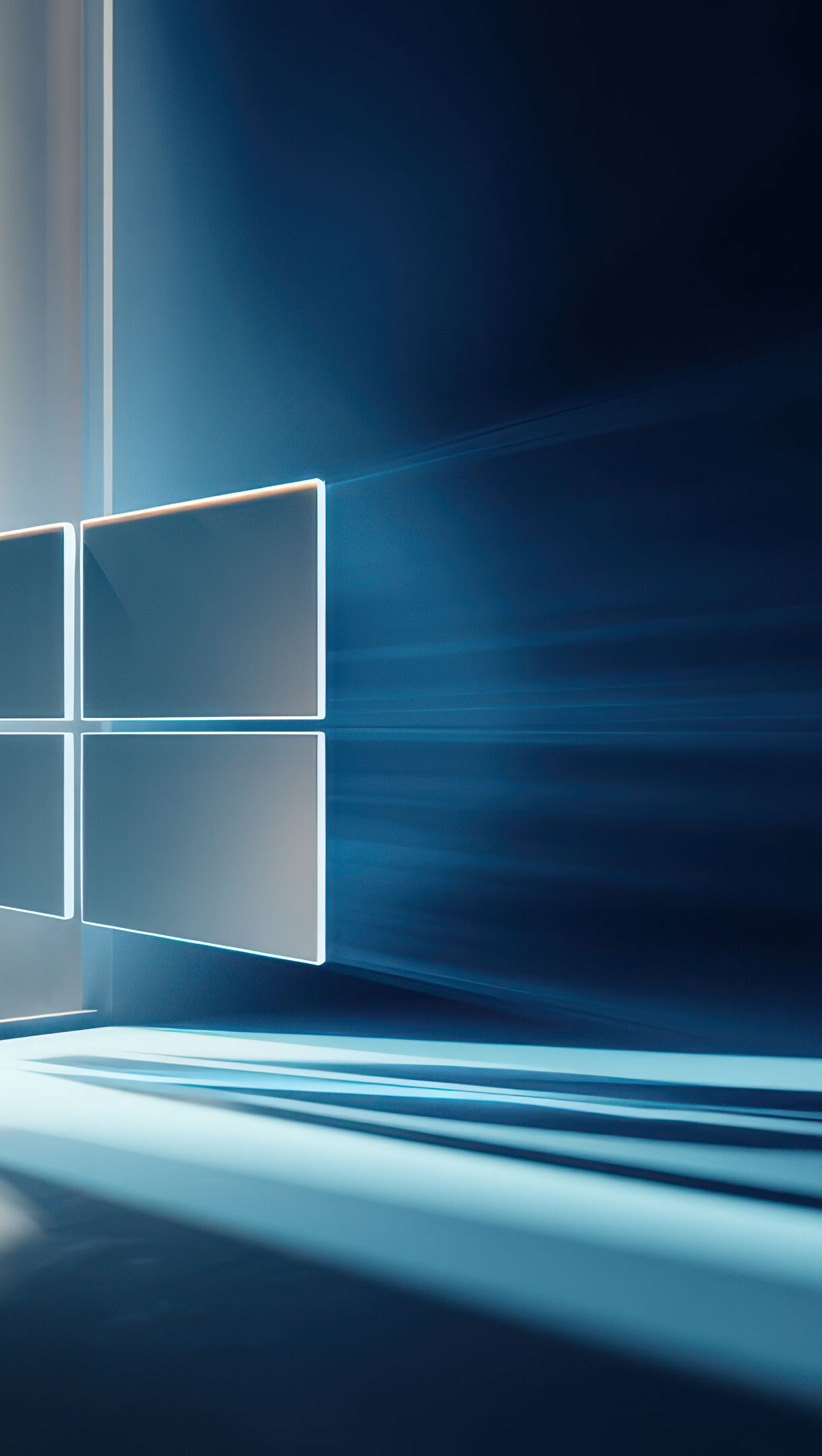 An ethereal 4K wallpaper portraying the modern Windows logo as four glowing, semi-transparent panes set within a dark, abstract blue chamber. Striking beams of light emanate from the left, illuminating the logo and creating dramatic horizontal light trails and reflections across the deep blue floor.