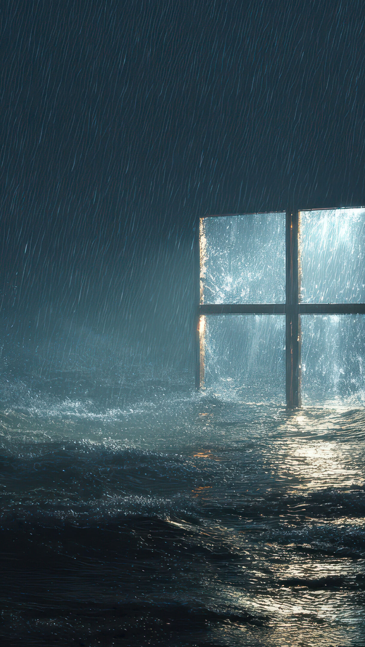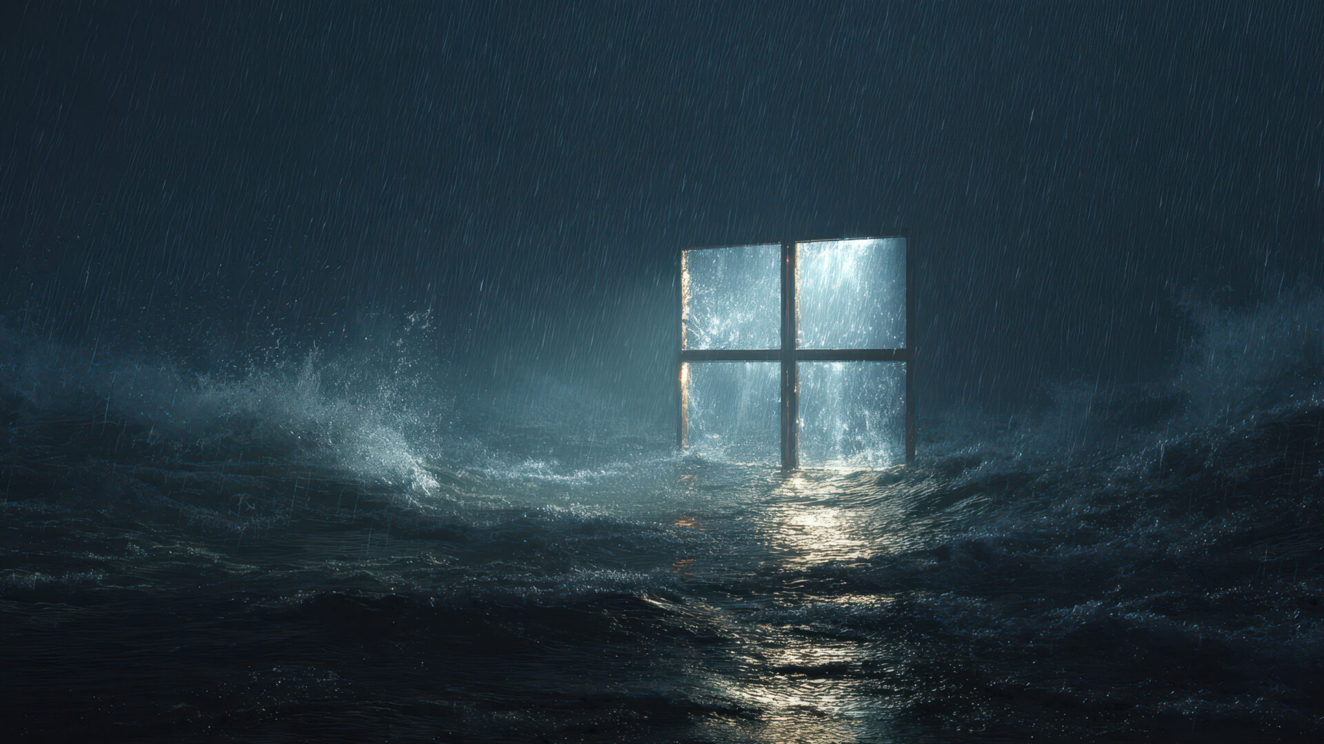 An immersive 4K wallpaper showcases a luminous Windows logo standing resiliently amidst a powerful, dark ocean during a raging storm. Brilliant light from the logo pierces the torrential rain and reflects across the churning, dark waves, creating a dramatic interplay that emphasizes the storm's raw power.
