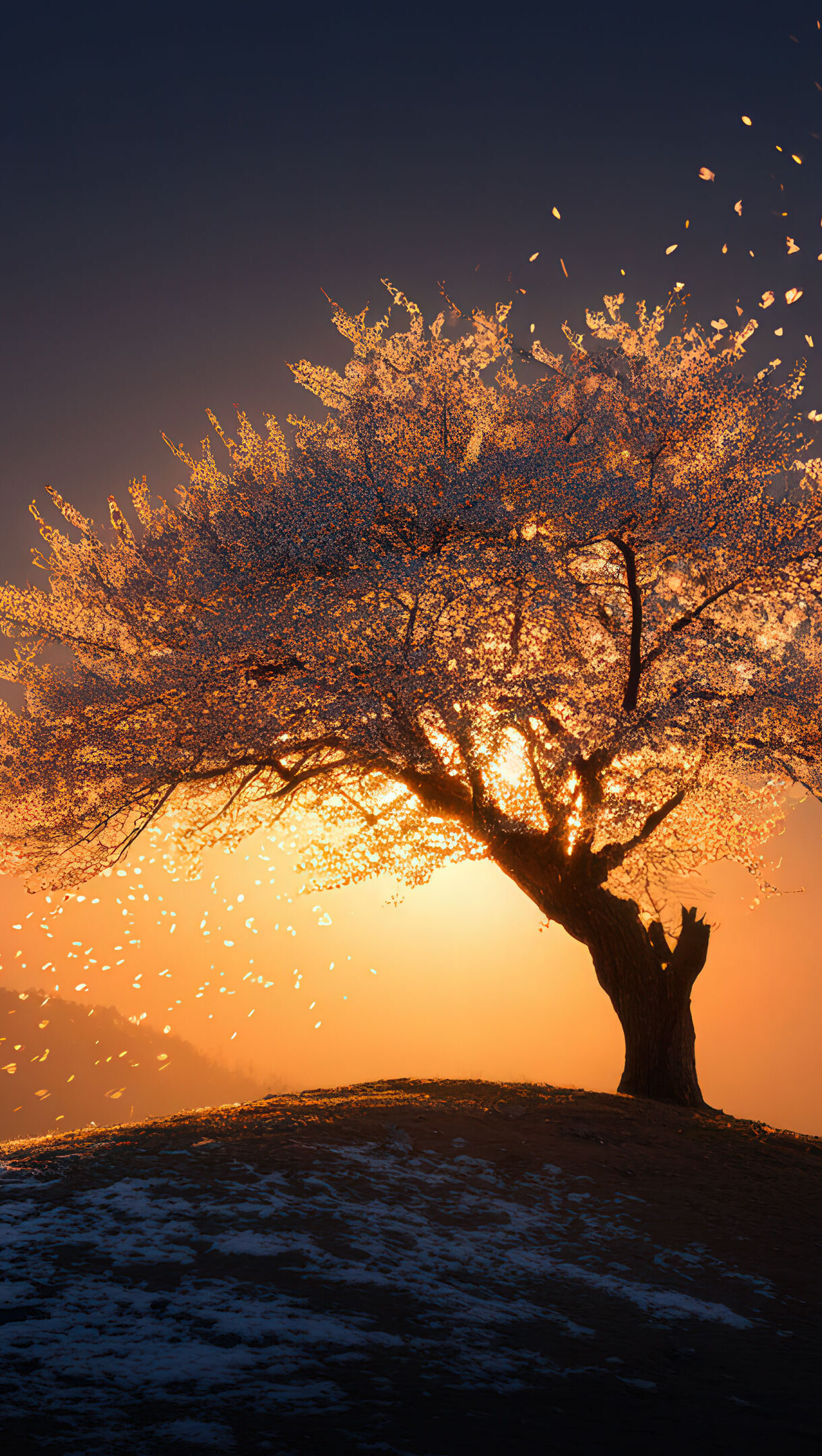 A magical wallpaper of a lone winter blossom tree on a snow-dusted hill, set against a brilliant sunset. The warm, golden light illuminates the delicate blossoms, creating a stunning contrast with the cool snow below.
