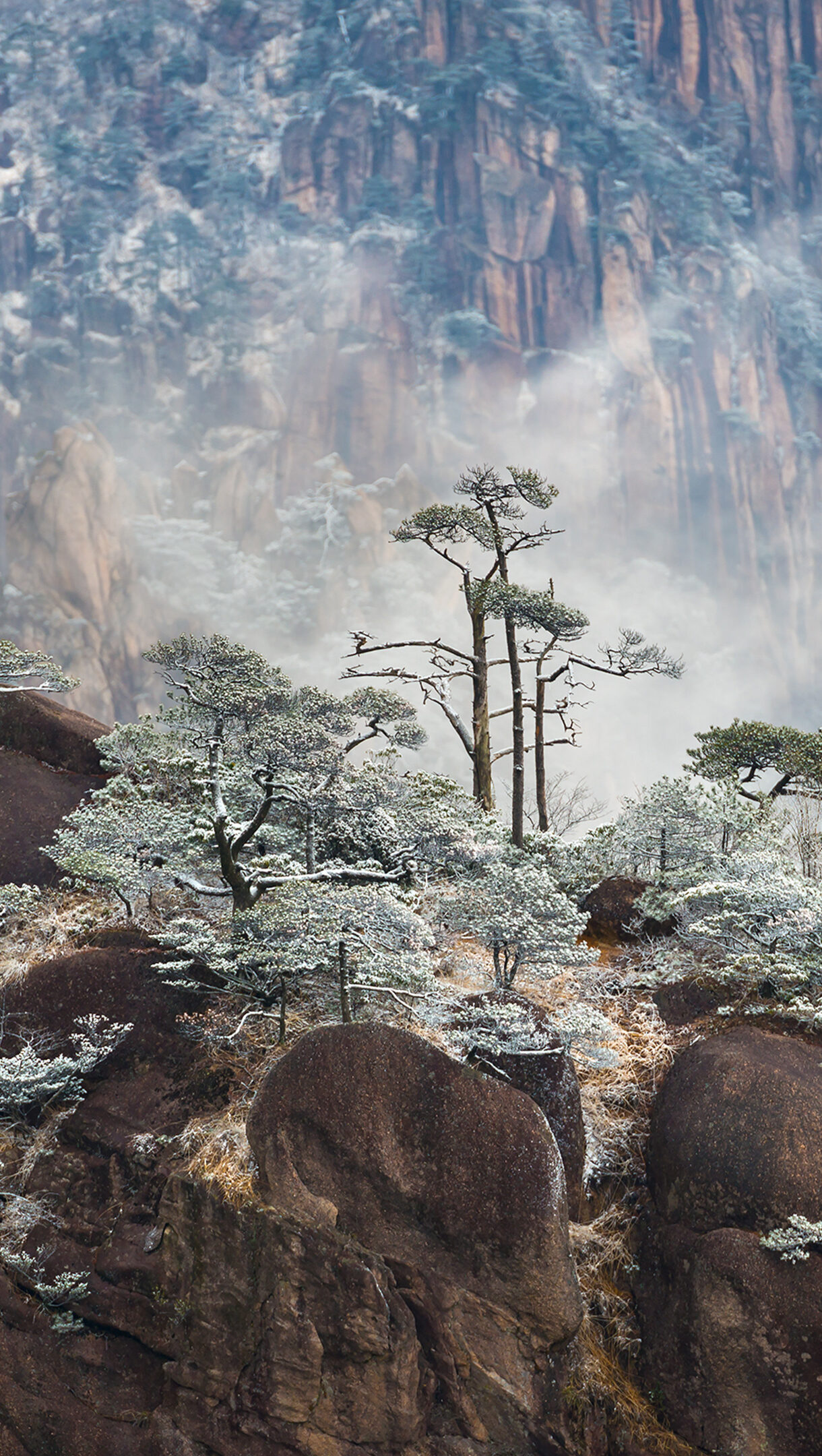 Winter Huangshan China Snow Pine Trees Foggy Mountain Wallpaper