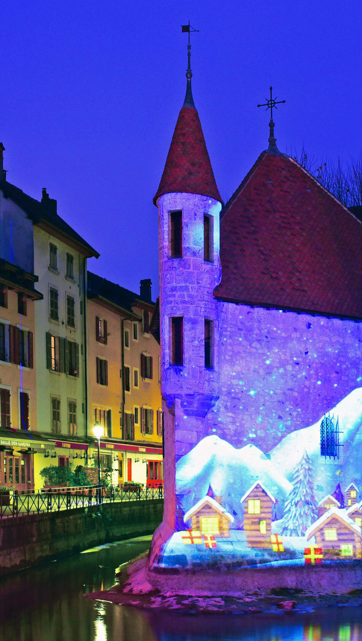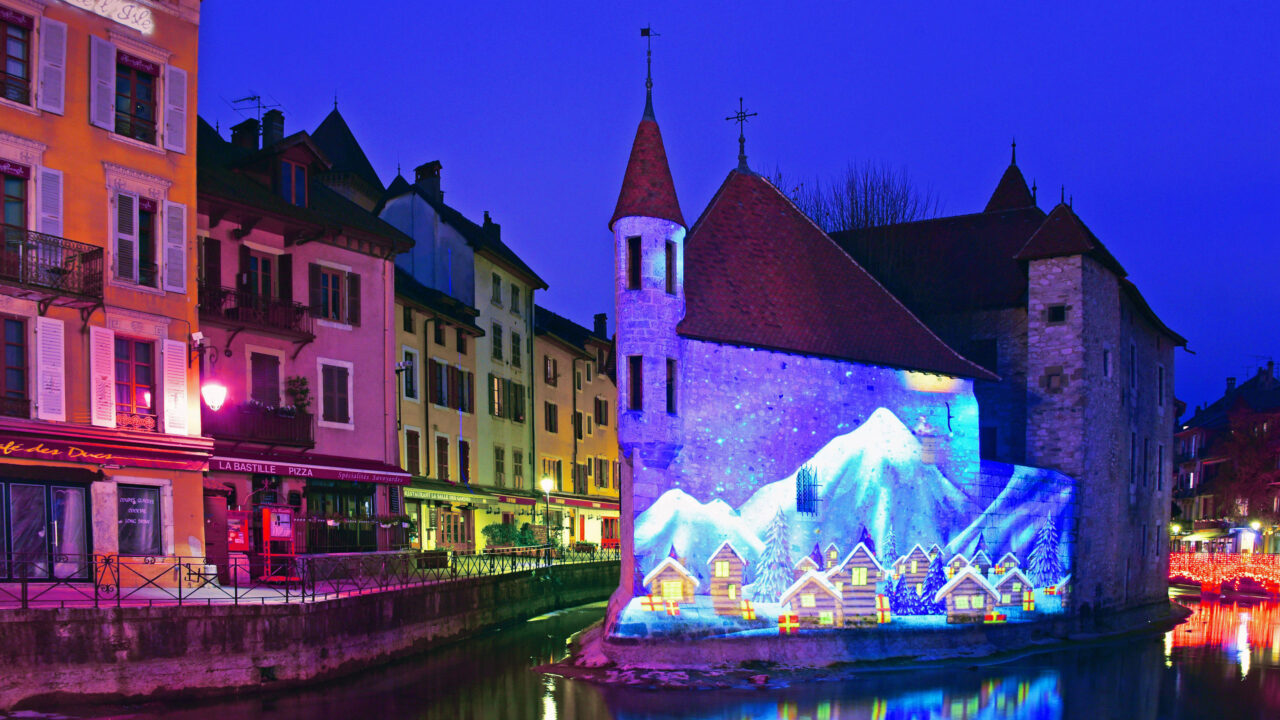 An enchanting 4K wallpaper showcasing the historic Palais de l'Isle in Annecy, France, at night, situated in the middle of a tranquil canal. Its stone facade is adorned with a vibrant winter illumination projection depicting a festive snowy village scene, casting dazzling reflections onto the deep blue water.