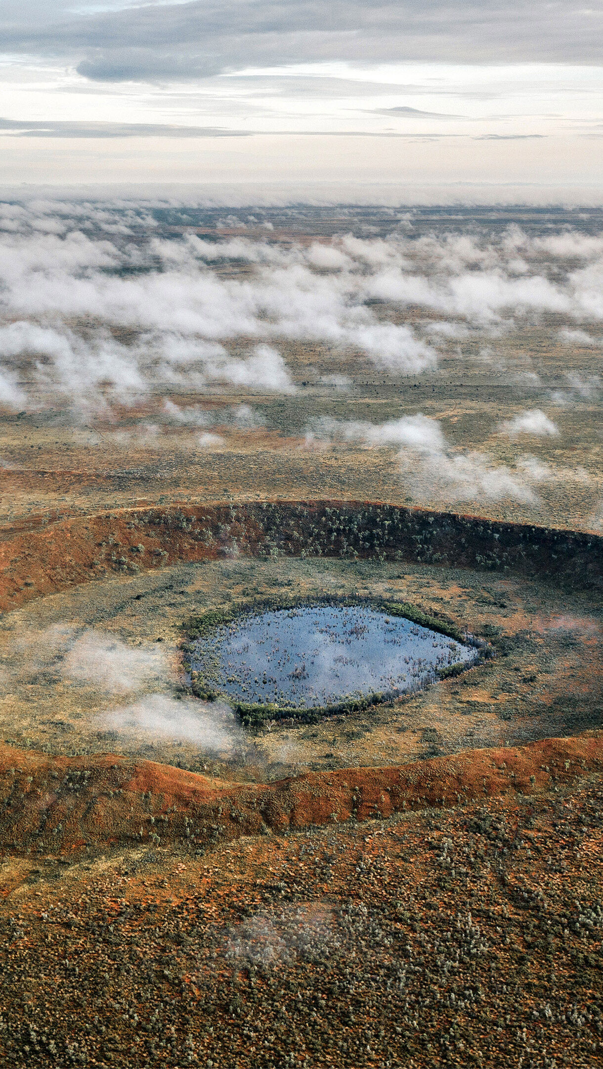 An awe-inspiring 4K wallpaper presents an aerial view of the majestic Wolfe Creek Crater nestled within the expansive Australian desert landscape. Its sharply defined, reddish-orange rim encircles a tranquil dark blue pool, with wisps of low-hanging clouds drifting across the textured, scrub-dotted terrain, enhancing the remote and grand scale.