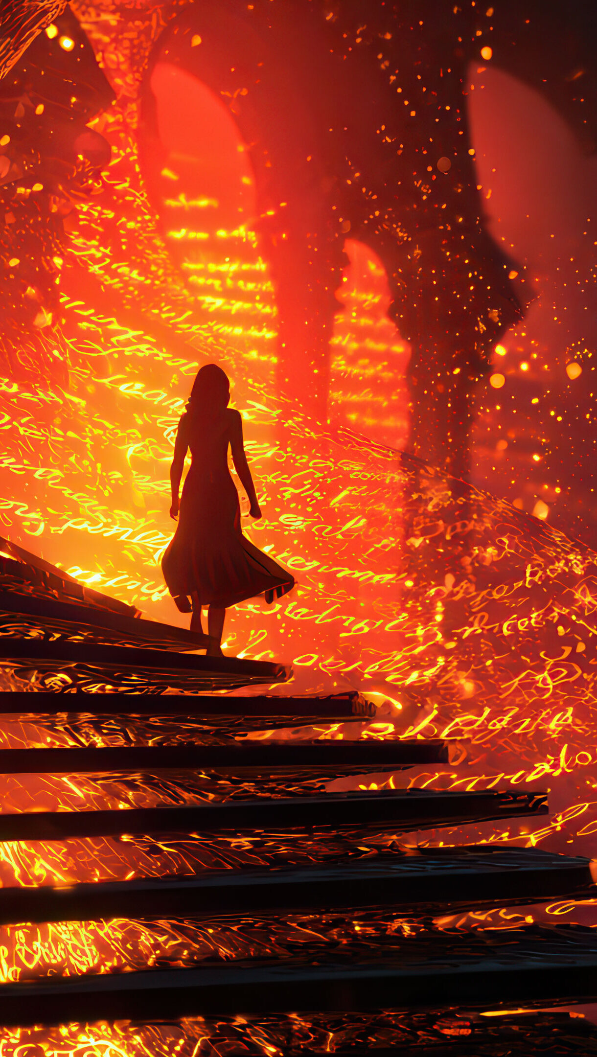 An evocative 4K wallpaper featuring a silhouetted woman ascending a grand, spiraling stairway in a dark, mystical cavern. Golden, luminous script and countless glowing particles swirl around her, casting the scene in a warm, fiery amber light that creates a powerful sense of an ethereal journey.
