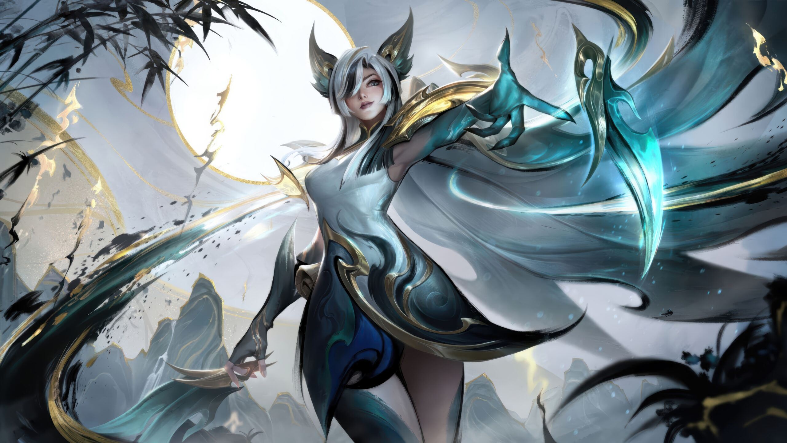 A captivating 4K wallpaper featuring Xayah in her Calligraphia skin from LoL Wild Rift, gracefully poised against an ethereal, ink-washed landscape of mountains and bamboo. Her intricate white, teal, and gold attire flows dynamically, mirroring brush strokes amidst swirling dark ink and shimmering golden accents, all highlighted by a radiant, full-moon-like glow.
