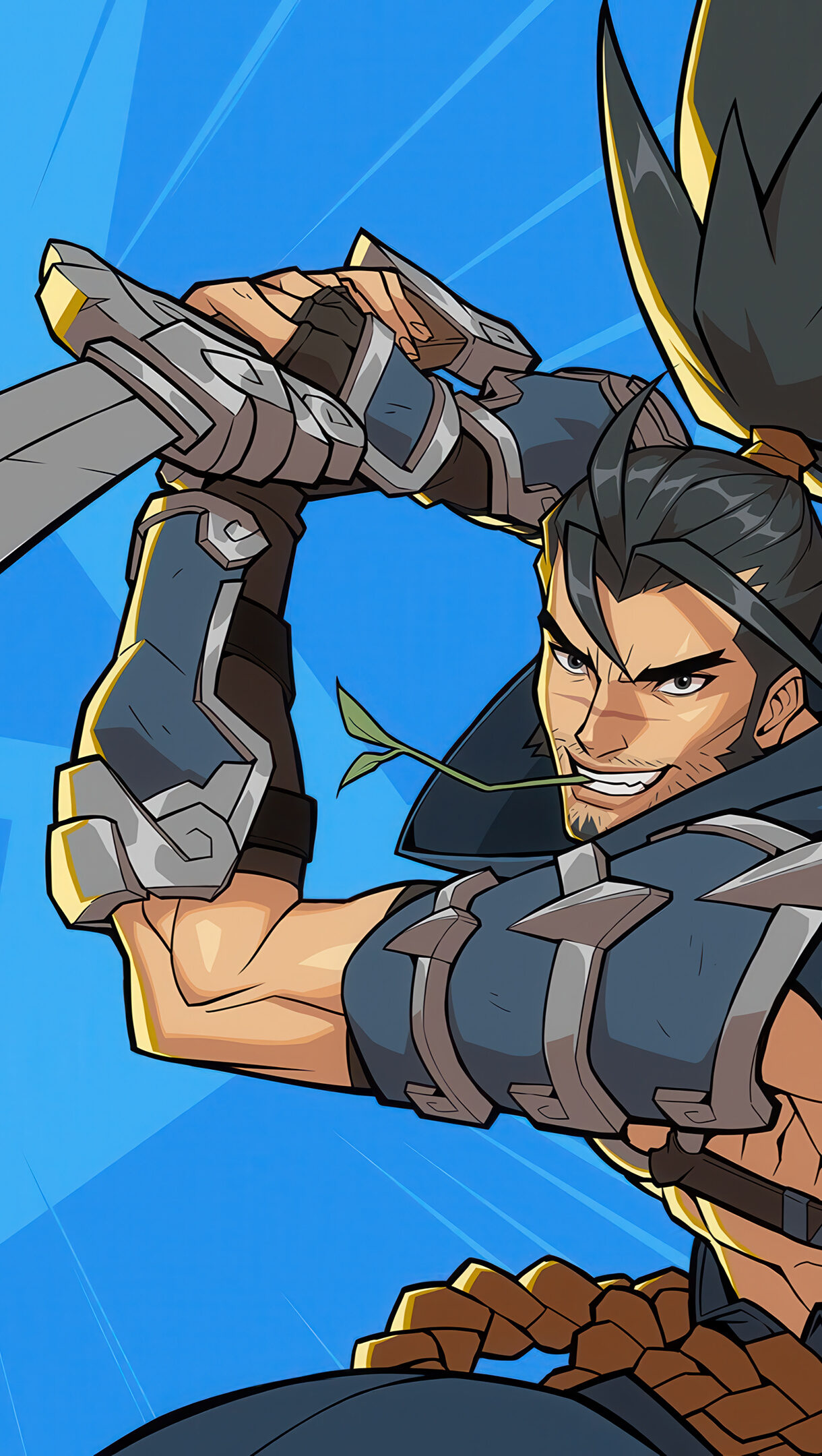 A dynamic 4K wallpaper showcasing the League of Legends character Yasuo, a fierce swordsman, against a vibrant blue background with radiating motion lines. His determined expression and powerful grip on the katana, subtly accented by a green stem in his mouth, convey a cool readiness for action.