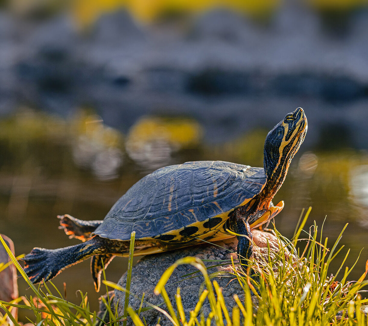 A captivating 4K wallpaper featuring a Yellow-bellied Slider Turtle comfortably basking on a sun-drenched rock at the water's edge. Golden sunlight illuminates the turtle's patterned shell and striped neck as it soaks in the warmth, creating a serene and vibrant natural scene.