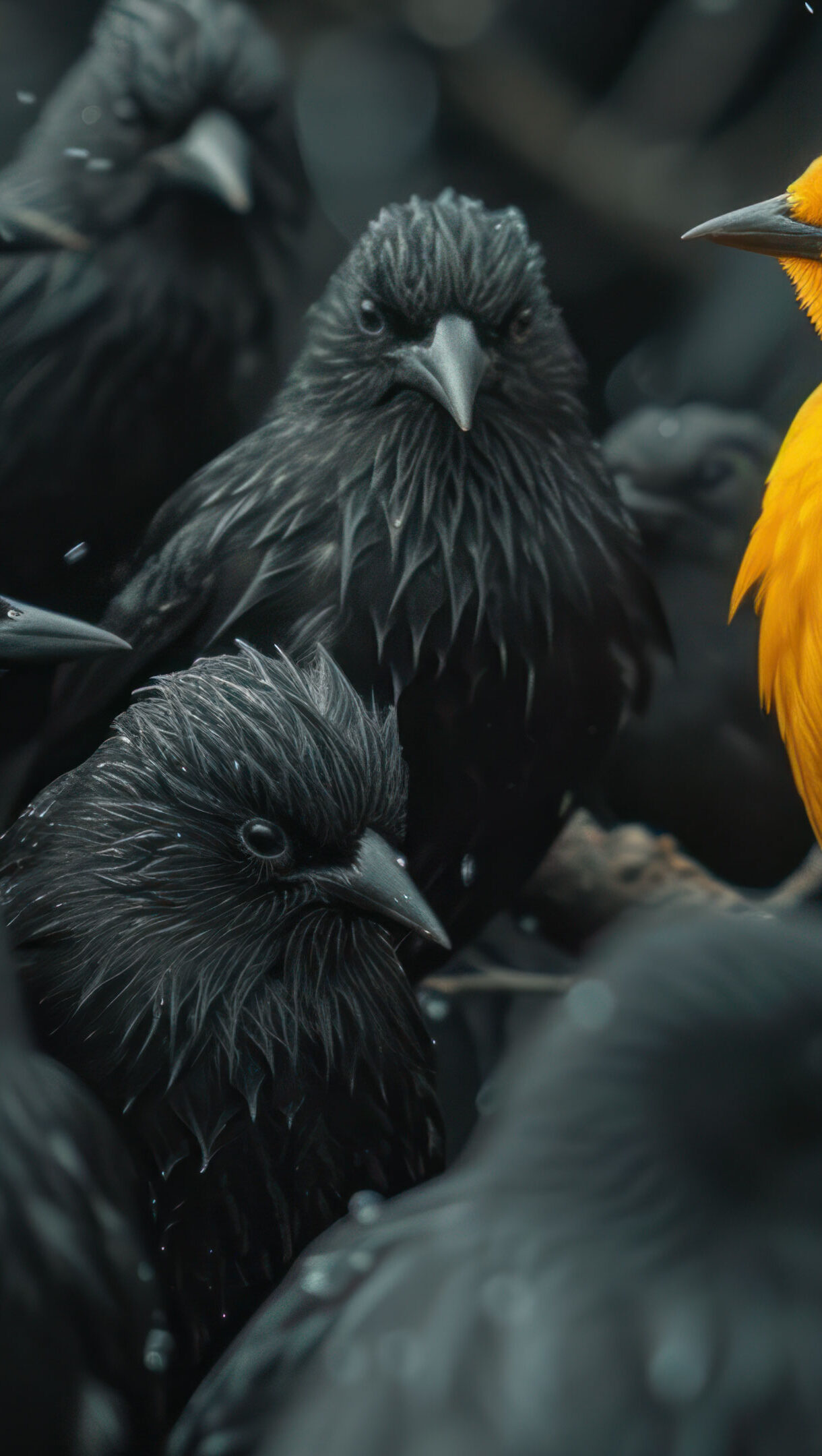 Experience the striking contrast of a lone yellow bird surrounded by a flock of crows in this AI-generated 4K wallpaper. Although not a direct representation, the digital art composition captures the unique beauty of a vibrant bird standing out among its monochromatic counterparts, perfect for high-resolution displays.