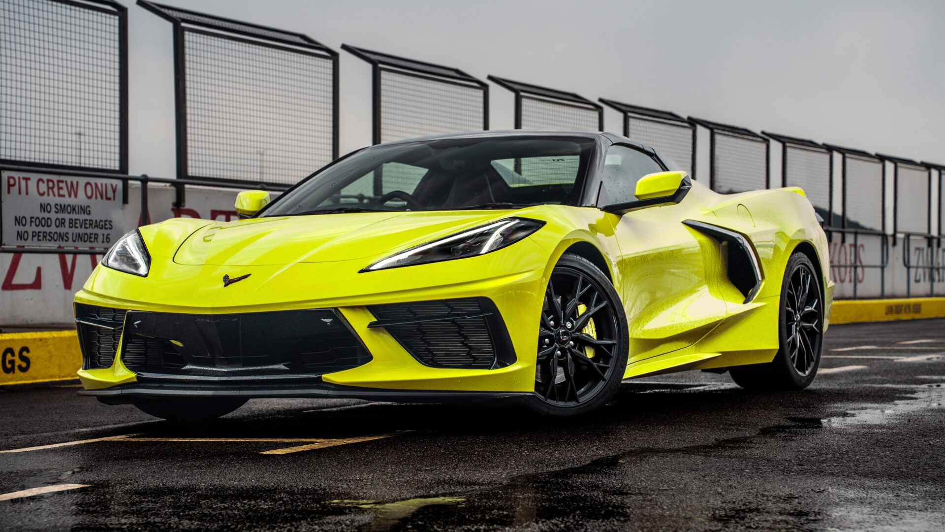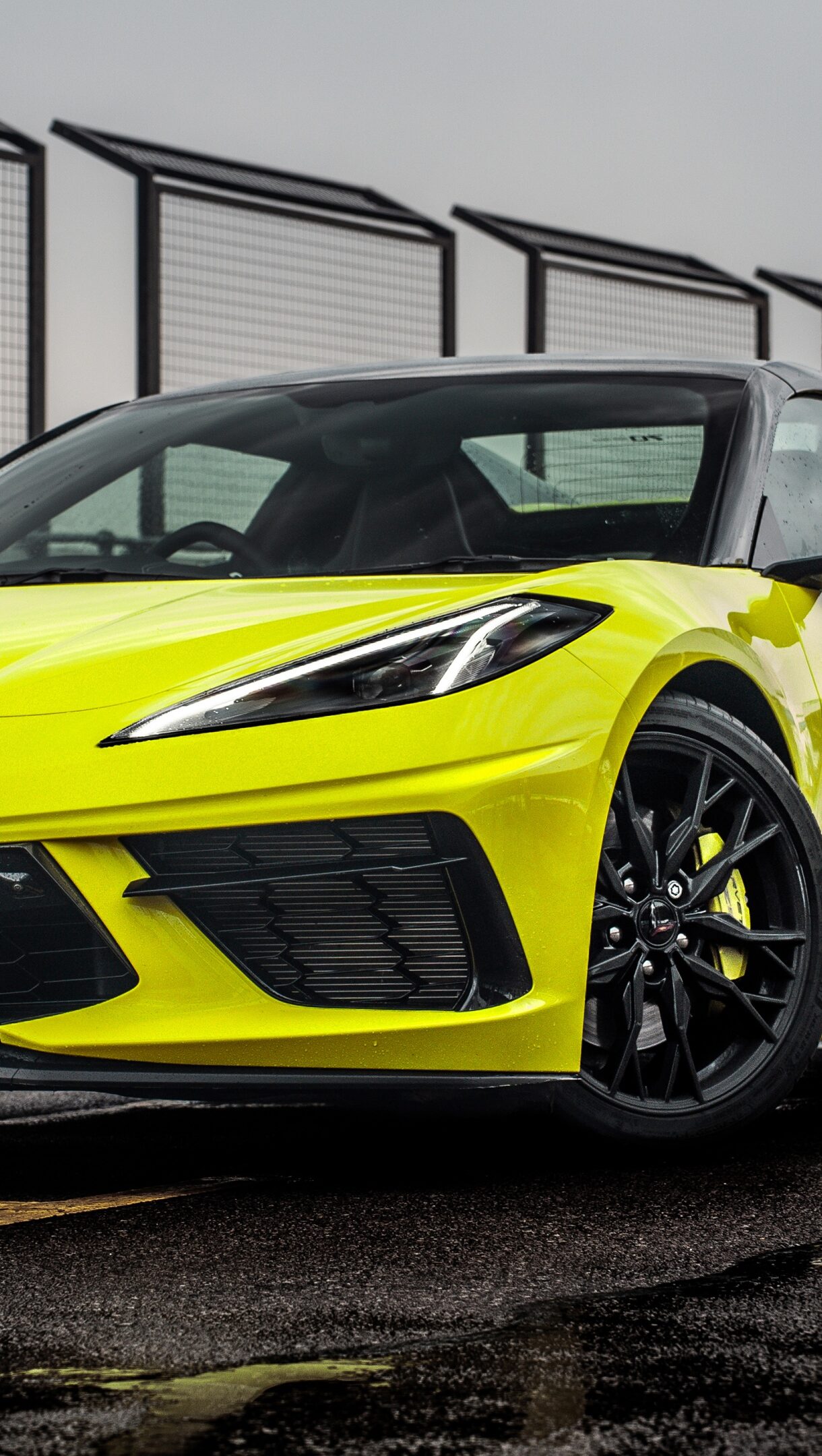 A dynamic 4K wallpaper showcasing a brilliant yellow Chevrolet Corvette C8 sports car parked on a dark, wet asphalt track. The car's sharp lines and black accents gleam under the overcast sky, reflecting in the puddles and creating a powerful, moody scene.