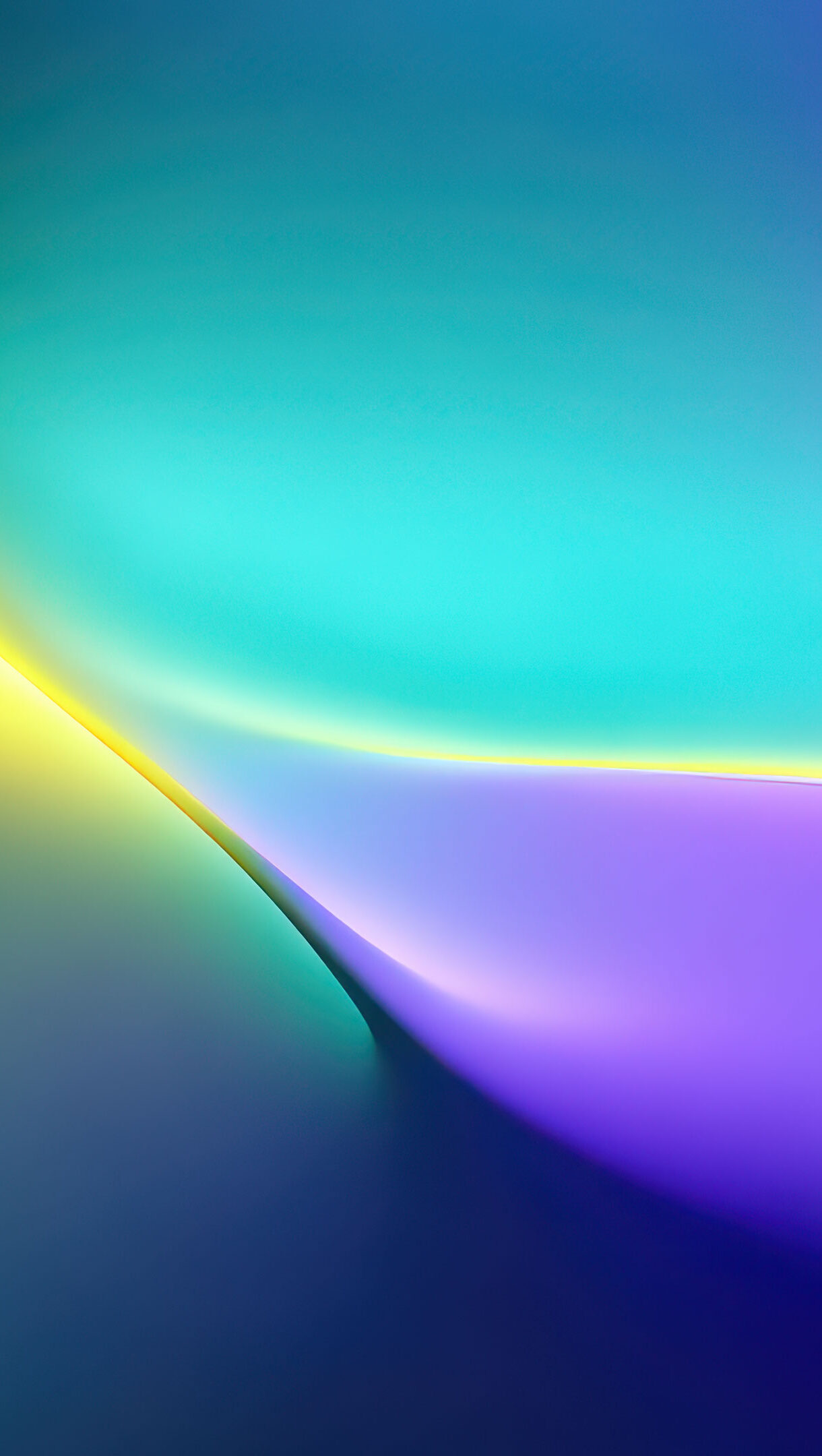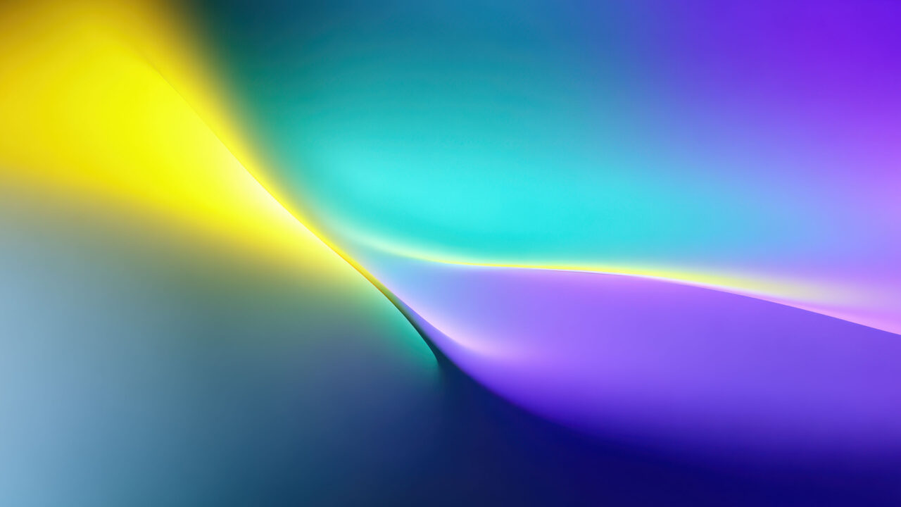 A captivating 4K wallpaper showcases an abstract wave design flowing across the screen, rendered in vibrant shades of yellow, teal, and purple. The dynamic interplay of these bright colors creates a luminous and engaging visual, highlighting the smooth contours of this digitl art piece.