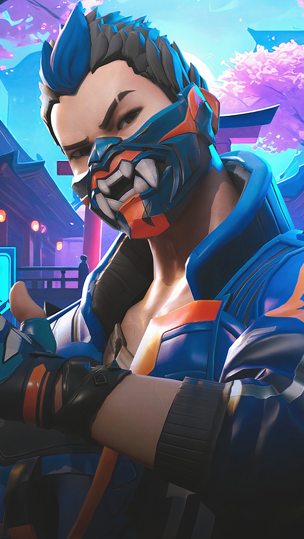 A stunning 4K wallpaper featuring Valorant's Yoru, his fierce masked face prominent, set within a vibrant, stylized Japanese temple garden at dusk. The interplay of neon blue and purple light on his armor and the soft pink cherry blossoms creates a mystical and atmospheric mood.