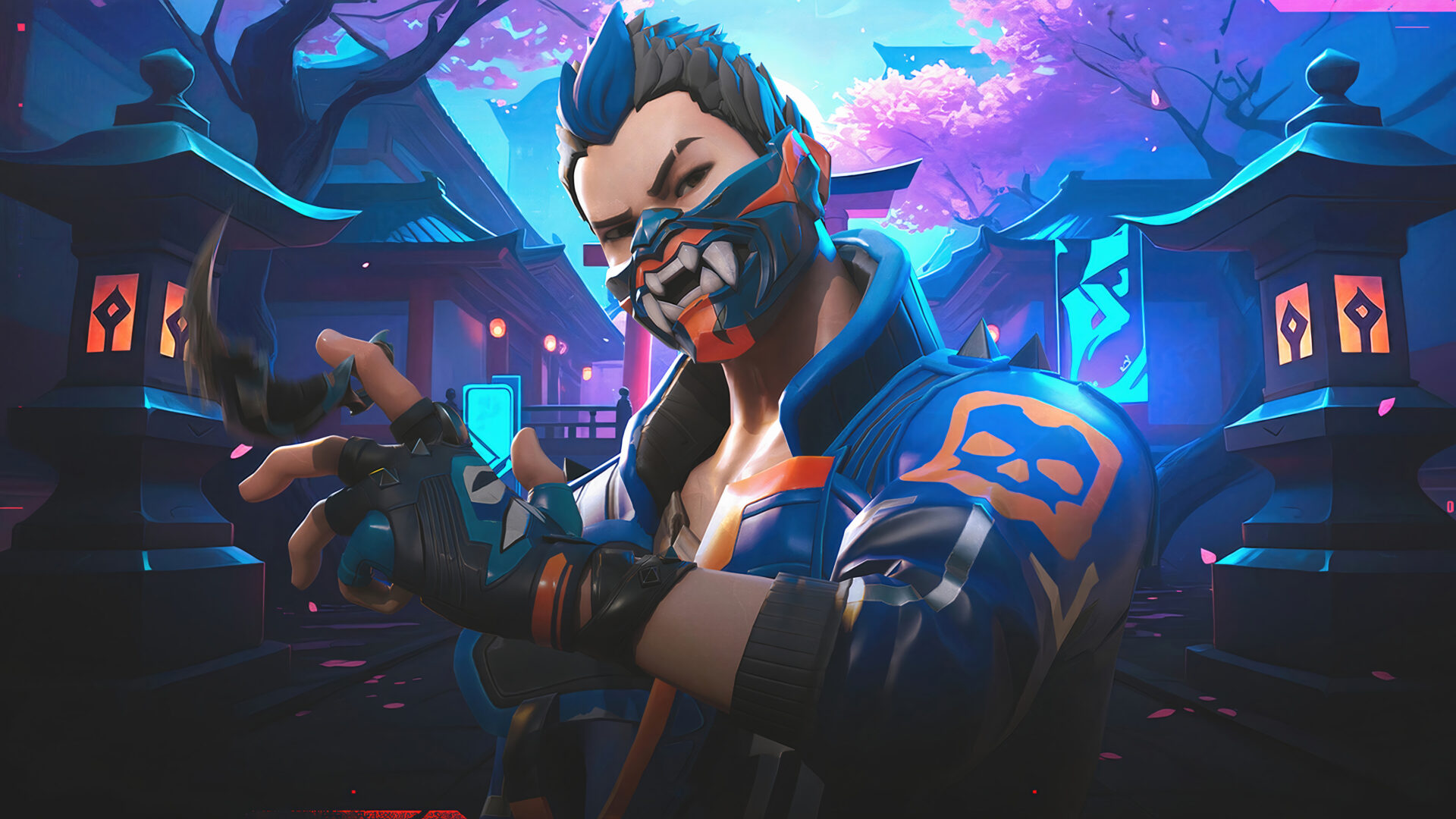 A stunning 4K wallpaper featuring Valorant's Yoru, his fierce masked face prominent, set within a vibrant, stylized Japanese temple garden at dusk. The interplay of neon blue and purple light on his armor and the soft pink cherry blossoms creates a mystical and atmospheric mood.