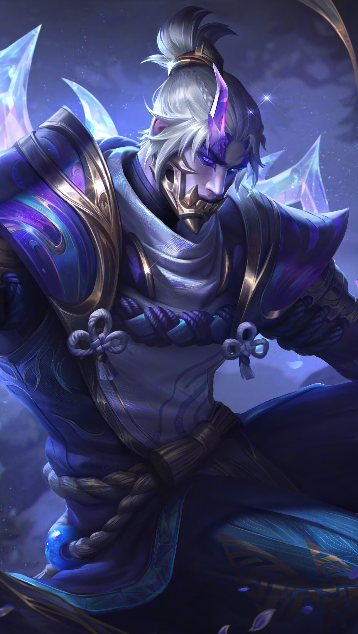 A breathtaking 4K wallpaper depicts Zed in his Prestige Spirit Blossom skin, poised powerfully in a mystical, moonlit forest. His vibrant purple and gold armor, along with the sharp, luminous crystal blades emanating cool blue light, creates an ethereal and imposing presence amidst the dark, glowing flora.